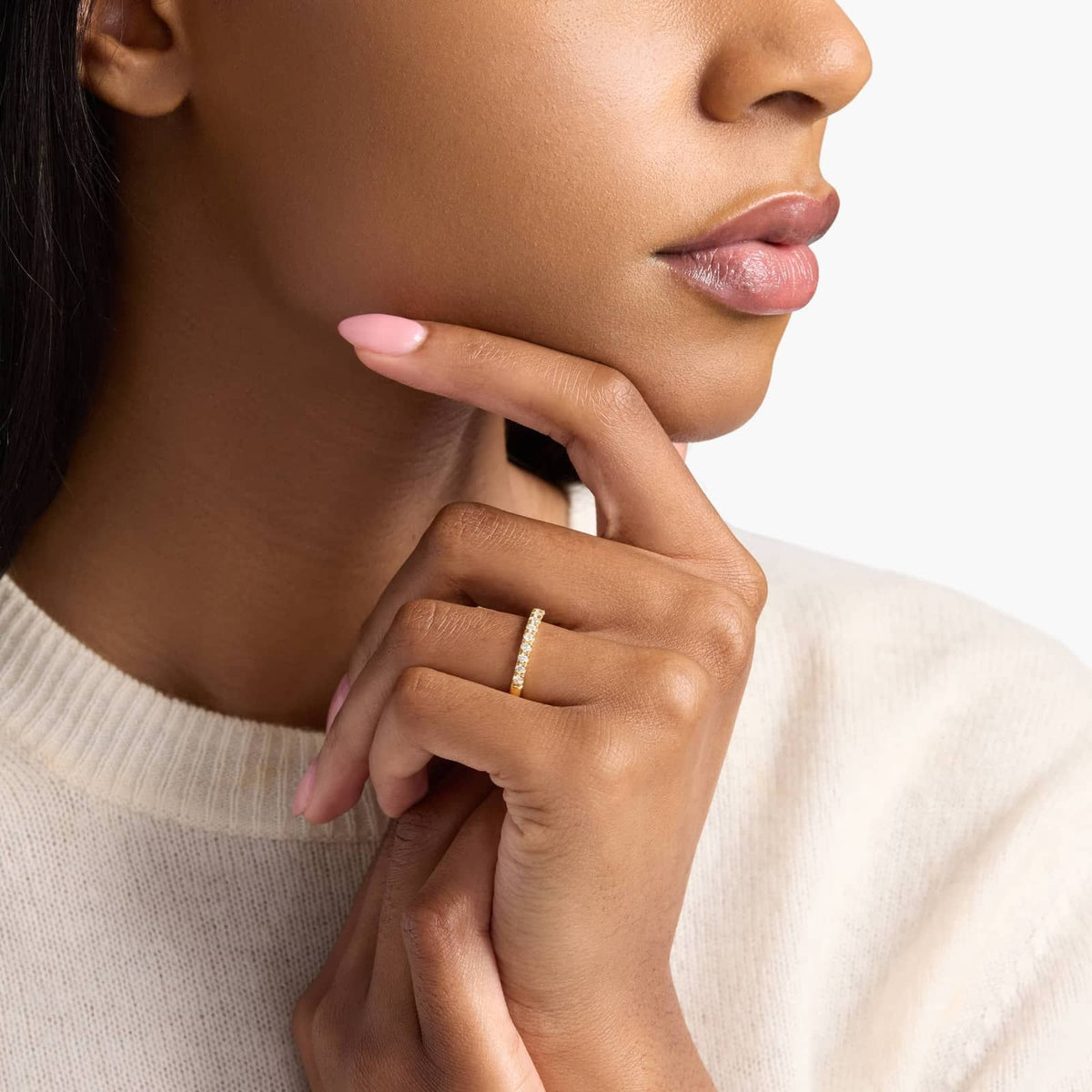 The Scalloped Pavé Diamond Ring in 18K Yellow Gold was made for the woman who wants romance in the details—and undeniable light in every angle. Crafted in rich 18K yellow gold, this band is set with diamonds totaling 1/2 carat total weight, arranged in a scalloped pavé setting designed to intensify sparkle and create a softer, more feminine silhouette.